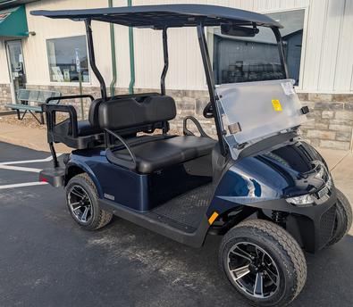 Patriot Blue, Stone Seats, Top, Windshield, Mirror, Headlights, Taillights, Brake Lights, State of Charge Meter, Manual Dump Box, Single Samsung Lithium Pack w/8 Year Warranty, Charger,& 2 Year Warranty