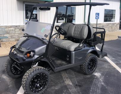 Charcoal Metallic, Black Seats, LED Hi/Lo Beam Headlights, Taillights, Brake Lights, Horn, Gas Gauge, Brush Guard, Windshield, Mirror, 4" Lift, 4 Passenger w/Rear Flip Seat w/Trunk, Premium Steering Wheel, 80" Black Top, 23" Paramount Tires on 14" Black Steel Rims, 13.5hp Kawasaki Engine, & 2 Year Warranty