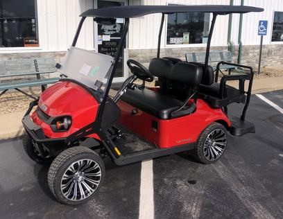 Flame Red, Black Seats, LED Hi/Lo Beam Headlights, Taillights, Brake Lights, Horn, Turn Signals, Gas Gauge, Brush Guard, Windshield, Mirror, 4 Passenger w/Rear Flip Seat w/Trunk, Glove Box Door, Premium Steering Wheel, 80" Black Top, 14" Aluminum Rims, 13.5hp Kawasaki Engine, & 2 Year Warranty