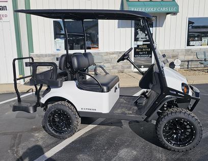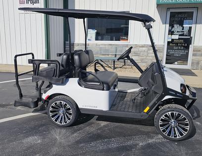 Bright White, Black Seats, LED Hi/Lo Beam Headlights, Taillights, Brake Lights, Horn, Turn Signals, Gas Gauge, Brush Guard, Windshield, Mirror, 4 Passenger w/Rear Flip Seat w/Trunk, Glove Box Door, Premium Steering Wheel, 80" Black Top, 14" Aluminum Rims, 13.5hp Kawasaki Engine, & 2 Year Warranty
