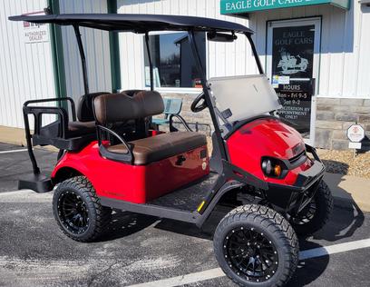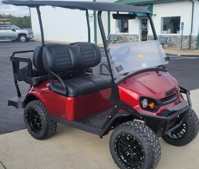 Flame Red, Briar Brown Seats, LED Hi/Lo Beam Headlights, Taillights, Brake Lights, Horn, Gas Gauge, Brush Guard, Windshield, Mirror, 4" Lift, 4 Passenger w/Rear Flip Seat w/Trunk, Glove Box Door, Premium Steering Wheel, 80" Black Top, 23" Paramount Tires on 14" Black Aluminum Rims, 13.5hp Kawasaki Engine, & 2 Year Warranty