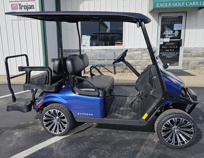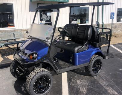 Electric Blue, Black Seats, LED Hi/Lo Beam Headlights, Taillights, Brake Lights, Horn, Turn Signals, Gas Gauge, Brush Guard, Windshield, Mirror, 4 Passenger w/Rear Flip Seat w/Trunk, Glove Box Door, Premium Steering Wheel, 80" Black Top, 14" Aluminum Rims, 13.5hp Kawasaki Engine, & 2 Year Warranty