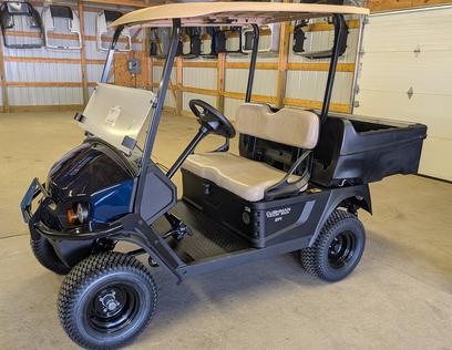 Patriot Blue, Tan Seats, Headlights, Taillights, Brake Lights, Horn, Gas Gauge, Brush Guard, Windshield, Mirror, Manual Dump Box, Top, 20" Tires, 13.5hp Kawasaki Engine, & 2 Year Warranty