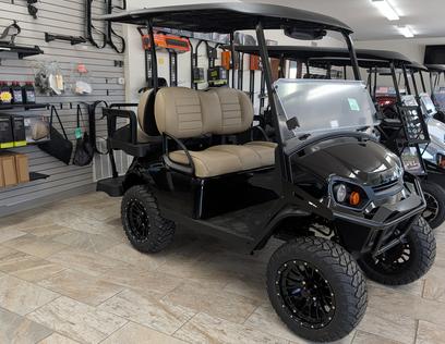 Black, Premium Beige Seats, LED Hi/Lo Beam Headlights, Taillights, Brake Lights, Horn, Gas Gauge, Brush Guard, Windshield, Mirror, 4" Lift, 4 Passenger w/Rear Flip Seat w/Trunk, Glove Box Door, Premium Steering Wheel, Black Top, 23" Paramount Tires on 14" Black Aluminum Rims, 13.5hp Kawasaki Engine, & 2 Year Warranty